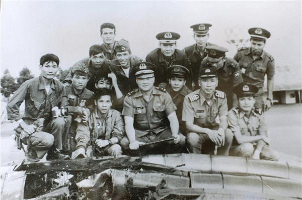 HÌNH ẢNH: ảnh kỷ niệm “Chuyến Bay Rùng Rợn Tết 1974”, trên chiếc phi cơ C-7A tử thần, toàn bộ phái đoàn Hải Quân và phi hành đoàn đứng trên cánh máy bay, bên cạnh cái máy phải bị phá hủy. Tư lệnh Hải Quân Đề Đốc Trần Văn Chơn, ngồi giữa hàng đầu, Đại tá Quỳnh bên cạnh với phái đoàn của Hải quân bên phải. Đại úy Kim (3 mai vàng trên ca lô, đứng khom lưng, sau tướng Chơn) Thiếu úy Tấn, (một mai vàng trên ca lô) Cơ phi Tr/s Dũng ngồi cạnh Đề Đốc Trần Văn Chơn, với phi hành đoàn của Đại úy Kim và một số nhân viên kỹ thuật bên trái. (cựu đại úy Kim sống ở bắc Calif, Th/u Tấn Houston và Tr/s Dũng Seattle). Ống khói nơi nối liền với động cơ đã bị nổ với một lỗ hỏng lớn trên lưng của động cơ phải.