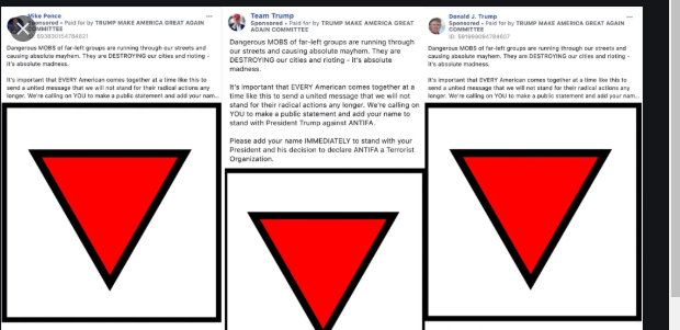 But the fact that the upside red triangle has been an explicit piece of deadly Nazi iconography for seven decades hasn’t deterred Trump’s 2020 campaign from using them in Facebook ads. This week, the campaign started running a series of ads, disparaging Antifa demonstrators and featuring a large, bright red, upside-down triangle. Antifa, is of course, short for anti-fascist. The red triangle was sewn on uniforms of people interned in concentration camps, including anti-fascist political prisoners. Millions of Soviet and Western anti-fascist soldiers died defeating Nazism, including hundreds of thousands of Americans.