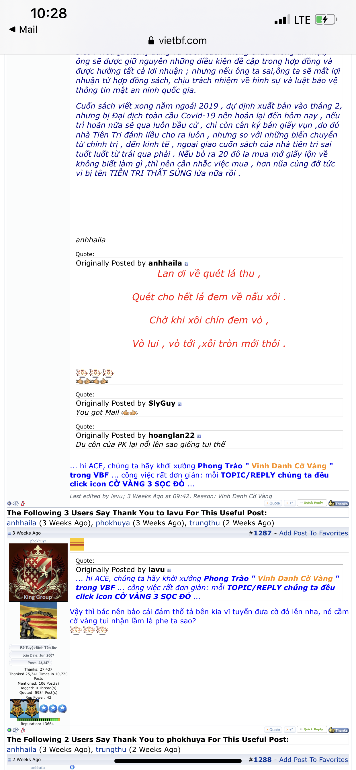 Còn về chú HL, ngây từ đầu câu chuyện này ko liên cang gì tới chú, tự chú chạy vào, tự chú phân minh về cờ vàng và những người bạn trong làng chửi của chú. Cái BT đưa ra là những gì Mod LV nói trong làng chửi về những topic gắn icon cờ vàng, và ông ta cũng là Mod phòng nhạc MP3. Người thông minh như chú, VT nghĩ chú và những người bạn chú đã thừa hiểu. Những gì mình làm không phải người ta không biết, chỉ là người ta không muốn nói... nhưng đừng xử ép và lấy chức Mod cựu hay chức Mod cao mà đàn áp... vì đó là chế độ CSVN... chú rất ghét VC đúng không? Vậy thì chú nên hiểu cảm giác chúng tôi ghi ra và góp ý...