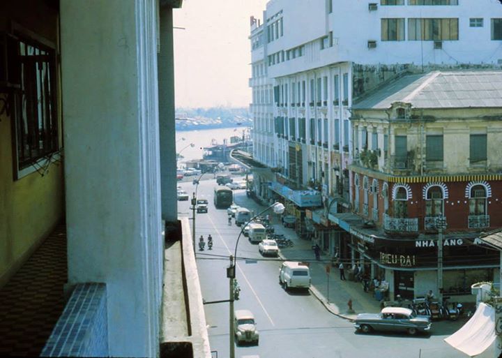 Saigon 1965 – Đường Trần Hưng Đạo, nhìn từ Plaza BEQ (135 Trần Hưng Đạo). Bên phải là Metropole Hotel.
