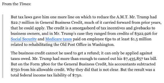 Đoạn thứ nhất viết năm 2016, TT Trump đã đóng trước 1 triệu đô tiền thuế, và năm 2017, đóng trước 4,2 triệu đô thuế. Sau đó, số thuế phải trả thực sự ít hơn nhưng IRS không bồi hoàn lại mà xung vào GBC để sau này có thể khấu trừ vào số thuế sẽ phải đóng những năm sau.