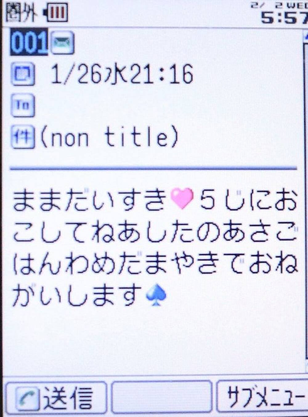 Trước khi ngủ, Hinamo thường gõ tin nhắn, thỉnh thoảng cô bé nhờ mẹ gõ giúp một vài từ. Khi mở điện thoại ram cô Hiromi phát hiện có tổng cộng 15 dòng tin nhắn.