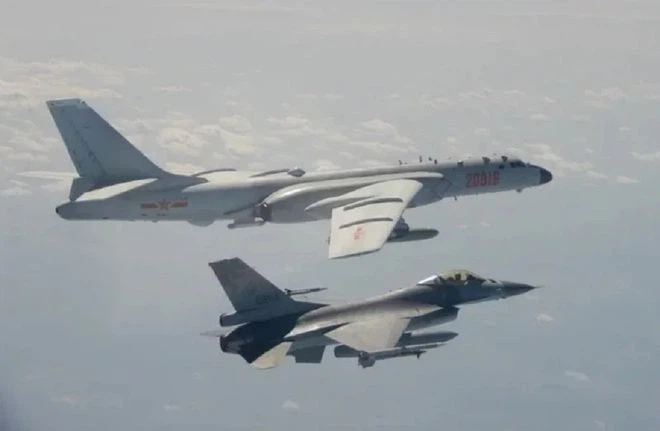Chiến đấu cơ F-16 của Đài Loan bay sát một máy bay ném bom H-6 của không quân Trung Quốc vào ngày 10/2 (Nguồn ảnh: Reuters)
