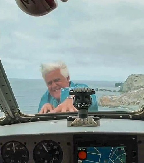 Bên dưới Jay Leno là những ngọn đồi đá ở đảo Catalina, ngay ngoài khơi Los Angeles. Jay Leno không hề buộc dây khi tḥ đầu, một nửa người ra ngoài. Trong video có thể thấy rơ mái tóc đầu trắng của ông từ từ nổi lên ở phía trước máy bay trước khi thấy chiếc áo màu xanh của Jay Leno.