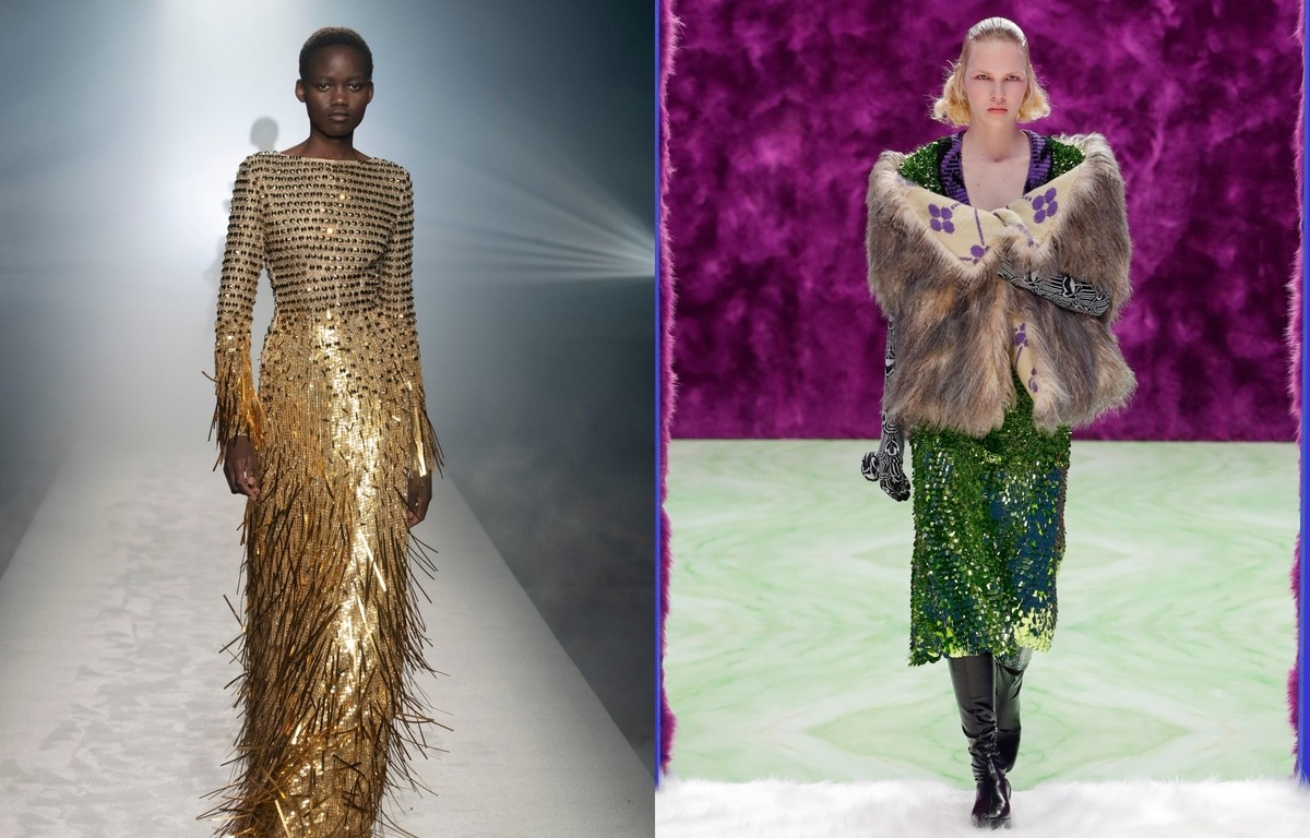 Dù đại dịch hoành hành, rất nhiều nhà mốt vẫn đẩy mạnh váy áo dự tiệc với những chất liệu bắt sáng như sequin, metallic, kim tuyến..., biến chúng trở thành một trong những xu hướng quan trọng của mùa Thu Đông năm nay.