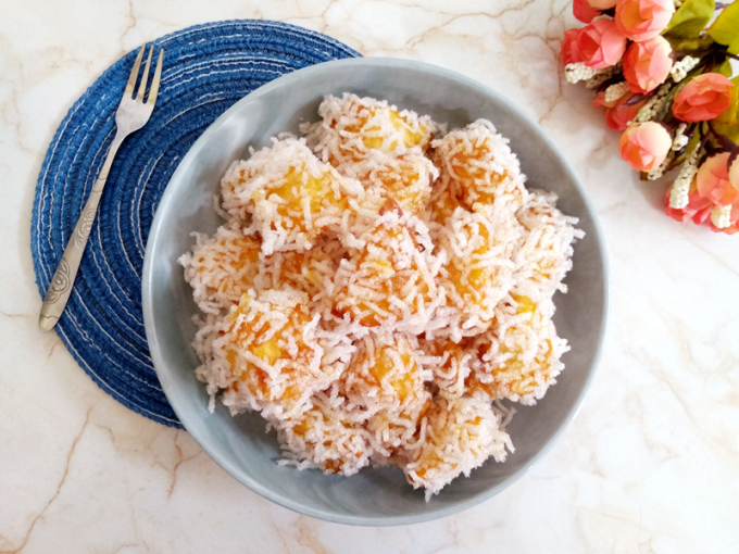 Bước 4: Đổ khoai đã sên đường vào thố miến, trộn đều cho miến phủ đều miếng khoai.