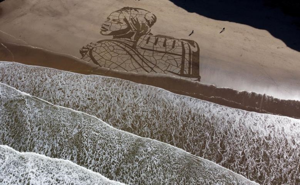 Bức chân dung trên cát ở Bãi biển Whitby, Anh ngày 15/3/2021. Bức vẽ do nghệ sỹ Jamie Wardley thực hiện khắc họa một đứa trẻ đang cõng thùng nước trên nền đất rạn nứt, bên cạnh dòng thủy triều đang dâng. Bức vẽ nhằm nhấn mạnh tác động của biến đổi khí hậu đối với nguồn nước.