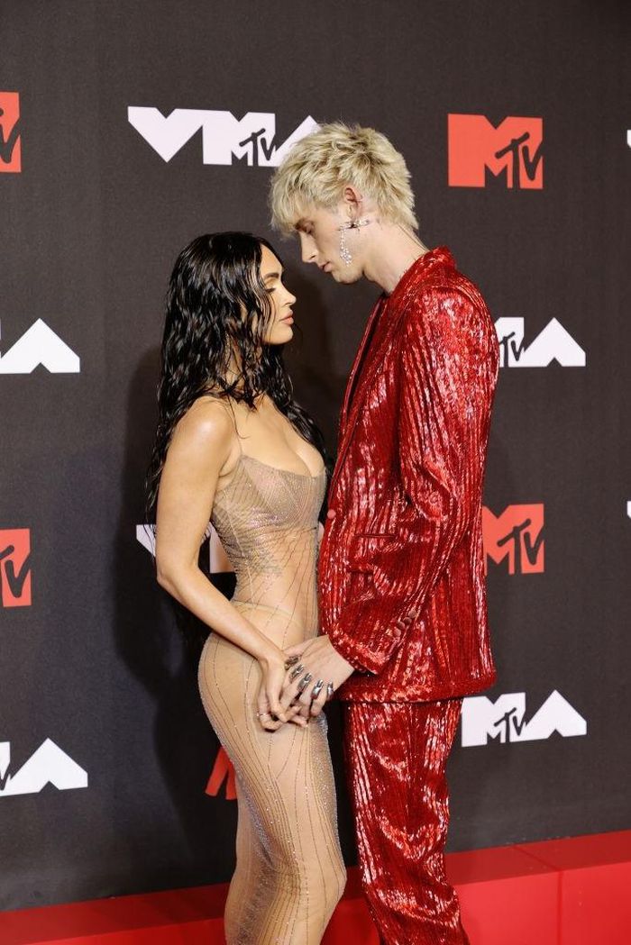 Fox mặc một chiếc váy gần như xuyên thấu của Mugler, trong khi Kelly diện trang phục đỏ lấp lánh từ Dolce & Gabbana và trang sức Chris Habana đến VMAs 2021. Footwearnews nhận xét đây là một trong những vẻ ngoài ấn tượng nhất của Kelly trên thảm đỏ. Ảnh: Kevin Mazur.
