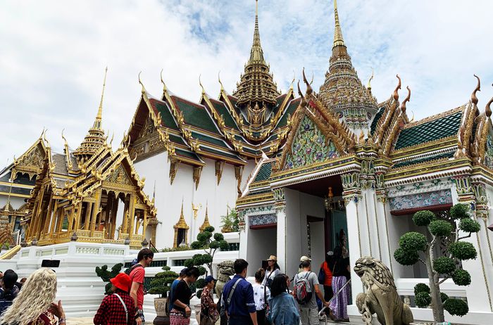 Nằm trong top 10 cung điện hoàng gia xa hoa nhất thế giới, đại hoàng cung Grand Palace là điểm tham quan nổi tiếng, thu hút du khách hàng đầu Thái Lan. Cung điện càng lung linh hơn khi vô số lá vàng dát trên các ngọn tháp phản chiếu ánh nắng mặt trời.