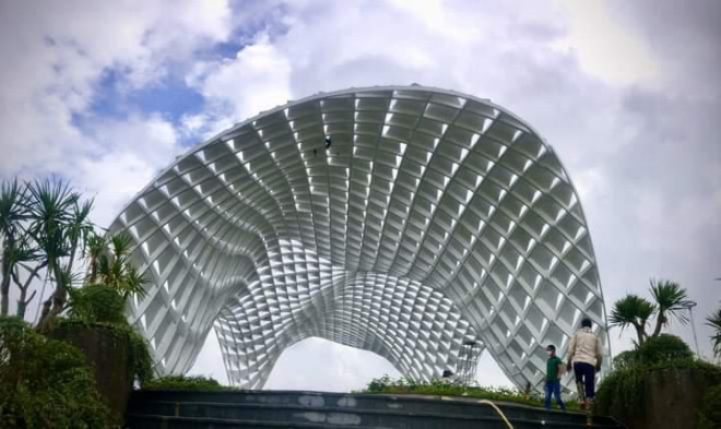 Các thanh sườn thép hộp có kích thước rộng 100mm, tại chân vòm cao khoảng 550mm và nhỏ lại khoảng 150mm tại đỉnh vòm và được cắt CNC để tạo đường cong uốn lượn. Trên các ô vuông mái vòm được lợp các vẩy thép dày 3mm cách điệu hình cánh diều. Phần vẩy cánh diều được mạ kẽm nhúng nóng sau đó sơn Epoxy chiều dày sơn 300mcr.