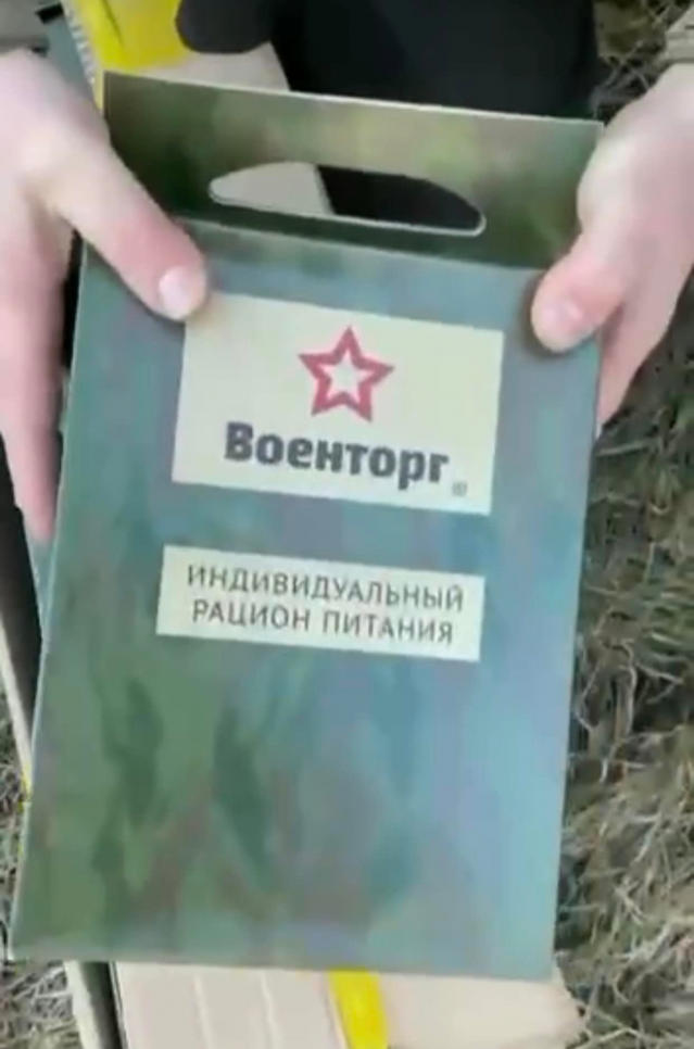 Hình ảnh video cho thấy: Binh sĩ Ukraine đưa ra những gói lương khô màu xanh lá cây và nói đây là lương khô dã chiến của quân đội Nga nhưng đã hết hạn vào năm 2015, trong khi thời điểm hiện tại là tháng 2/2022.
