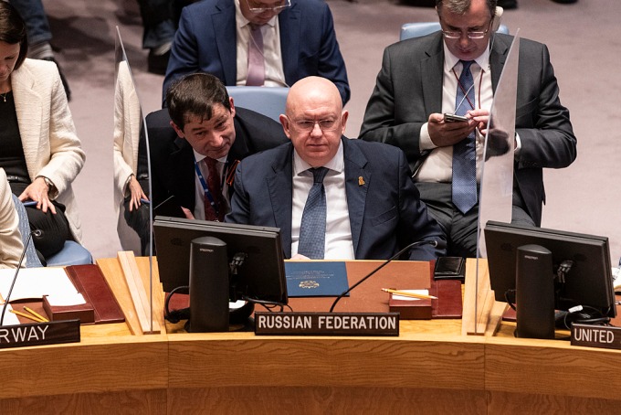 Đại sứ Nga tại Liên Hợp Quốc (giữa) dự cuộc họp về duy trì hòa bình và an ninh Ukraine tại Hội đồng Bảo an hôm 5/5. Ảnh: Reuters.