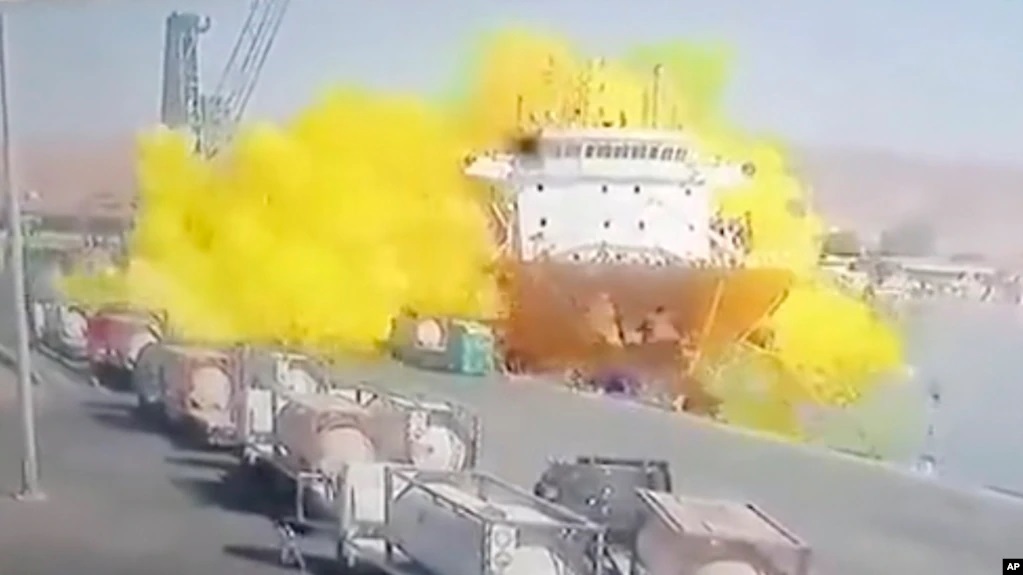 Ảnh chụp từ camera an ninh do Al-Mamlaka TV phát sóng về vụ nổ khí clo ở cảng Aqaba, Jordan, vào ngày 27/6/2022.