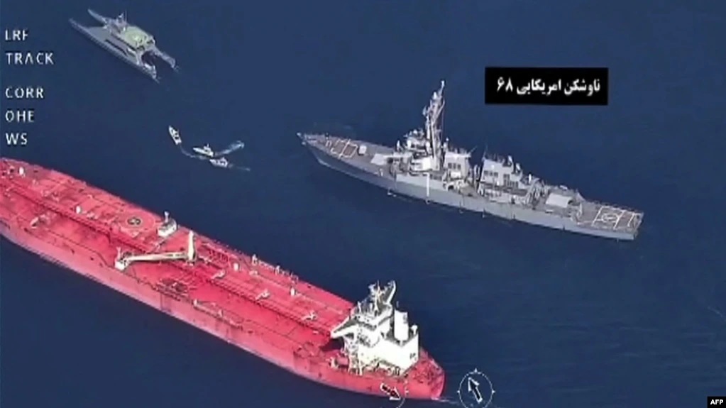 Ảnh chụp từ video phát trên truyền hình Nhà nước Iran hồi tháng 11/2021, cho thấy 1 tàu chiến của Mỹ (bên trên) và một tàu chở dầu mang cờ Việt Nam (bên dưới) ở Vịnh Oman. Mỹ và Iran lúc đó đưa ra các thông tin khác nhau về sự liên đới của tàu chở dầu mang cờ Việt Nam.