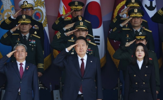 Tổng thống Yoon (ở giữa, hàng đầu) trong lễ kỷ niệm Ngày Lực lượng Vũ trang Hàn Quốc hôm 1/10. Ảnh: Yonhap.