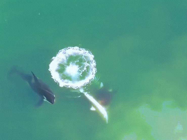 Một đoạn trong video nói trên được quay vào tháng 5, ghi lại cảnh đàn cá voi sát thủ (3-5 con) truy đuổi, bao vây và tấn công một con cá mập trắng lớn. Các nhà khoa học tin rằng có thêm 3 con cá mập trắng lớn khác bị tấn công đến chết trong chuyến đi săn đó.