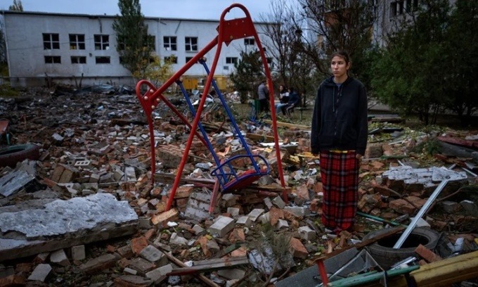 Người phụ nữ đứng giữa một sân chơi bị phá hủy bởi tên lửa ở thành phố Mykolaiv, miền nam Ukraine, hôm 23/10. Ảnh: AP.