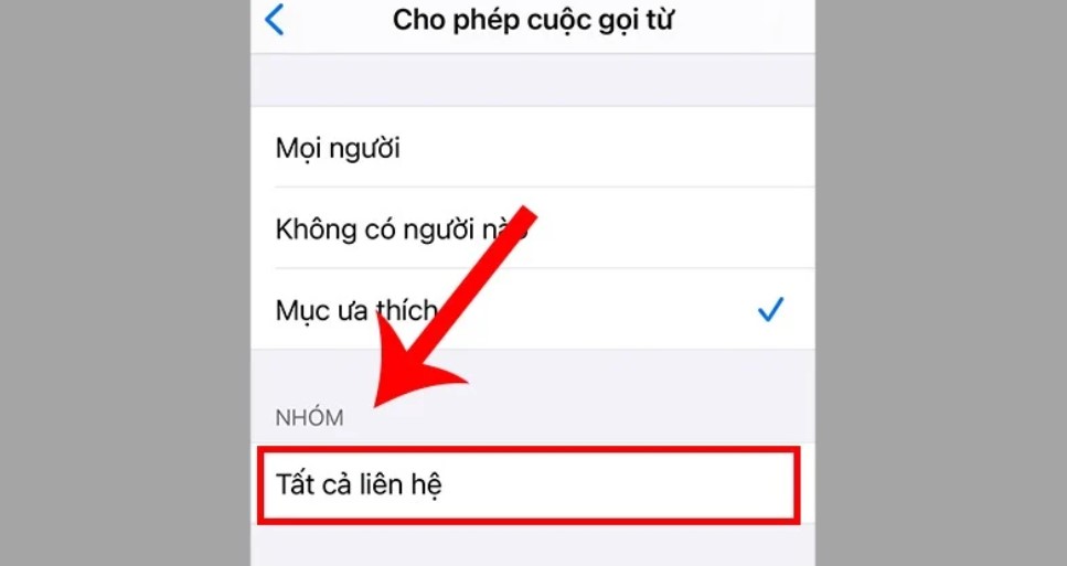Bước 3: Để chặn được các cuộc gọi ngoài danh bạ trên iPhone bạn hãy tiếp tục chọn vào mục “Tất cả liên hệ”. Lúc này hệ thống iPhone sẽ hiểu rằng cuộc gọi từ số không lưu trong danh bạ sẽ tự động được chặn. Bạn chỉ nhận được các cuộc từ các số điện thoại đã được lưu trên danh bạ mà thôi.