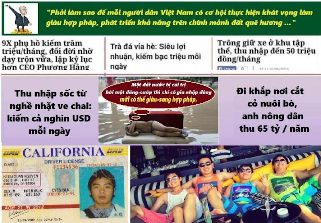 - Ồ! Vậy thì điều này có thật nè! Bằng chứng là họ xây được biệt phủ, sắm được siêu xe, của chìm của nổi vô số là nhờ họ chạy xe ôm, nấu rượu, buôn chổi đót, lá chít... Nếu các cậu còn nghi ngờ tôi nói láo thì cứ hỏi thẳng ông cán bộ đảng viên Phạm Sỹ Quý hoặc ông phó ban nội chính tỉnh uỷ Daklak Nguyễn Sĩ Kỹ sẽ rõ...