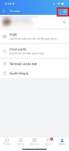 Bước 1: Mở ứng dụng Zalo trên thiết bị của bạn > Chọn biểu tượng Cá nhân ở góc dưới bên phải màn hình > Chọn biểu tượng Cài đặt hình răng cưa góc trên bên phải.