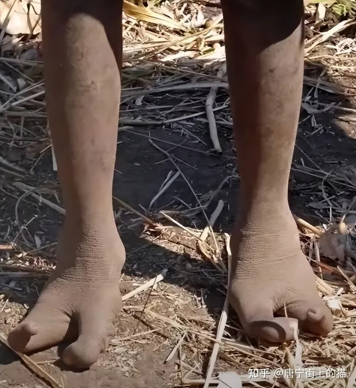 Bởi hiện tượng biến đổi gen gần như chiếm phần lớn dân số của tộc, nên hình hài đôi chân kỳ lạ đối với người Doma lại là hoàn toàn bình thường. Một số người còn có lớp màng mỏng ở chính giữa hai ngón chân khổng lồ. Hình ảnh này khiến ta liên tưởng đến chân của loài đà điểu. Ảnh: Zhihu