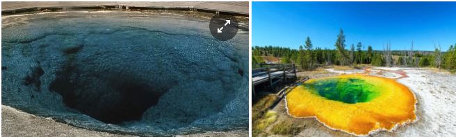 Morning Glory từng chỉ có màu nước xanh thẳm (trái) và bị đổi màu theo thời gian. Ảnh: Công viên quốc gia Yellowstone, Adobe stock.