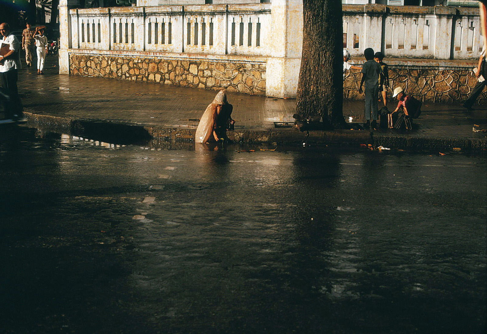 Sài Gòn vào một ngày mưa năm 1966, nhưng những người chạy xích lô vẫn miệt mài làm việc, vẫn khoác lên mình chiếc áo mưa củn cỡn để đưa khách đến nơi đến chốn