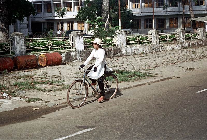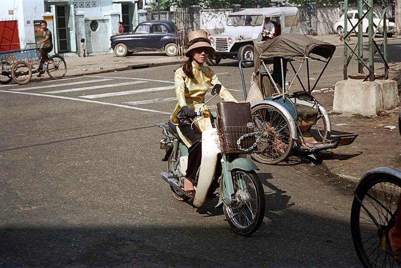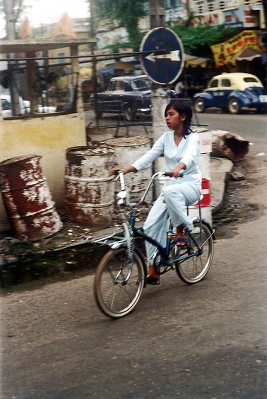 Cô gái với áo dài trắng láy xe trên đường phố Sài Gòn năm 1973