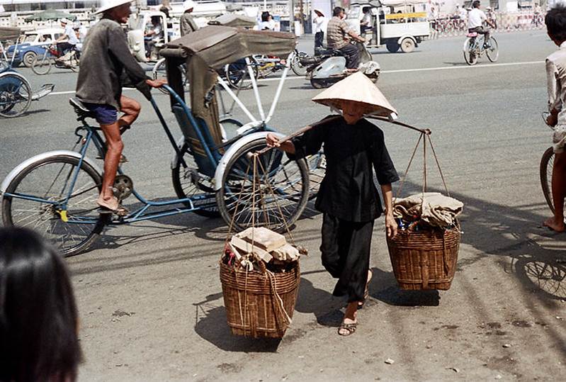Một người đang tựa người bên chiếc xích lô để chờ khách, nghề này khá vất vả bởi nó cần sức người khá lớn nhưng tiền phía cho mỗi chuyến đi lại rẻ. Ảnh chụp năm 1968.