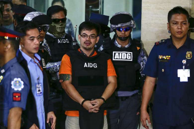 Trùm ma túy Philippines Rolando 'Kerwin' Espinosa Jr. (giữa) bị cảnh sát áp giải ở thành phố Quezon ngày 18-11 - Ảnh: Reuters