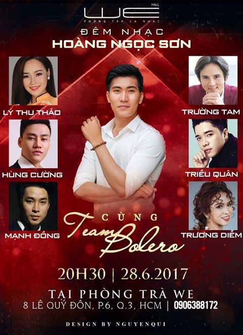 Sau khi kết thúc thần tượng Bolero 2017 để đáp lại tình cảm của quý khán giả Hoàng Ngọc Sơn cùng với những thí sinh được yêu thích tại thần tượng Bolero, #MC #HLV #QuangLê, khách tham dự #PhươngMỹChi , khách mời #TrườngTam sẽ trở lại với quý khán giả một đêm nhạc đầy chất Bolero vào lúc 20h30 ngày 28/6 tại phòng trà WE .rất mong được sự yêu thương và ủng hộ của cả nhà