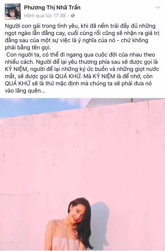 Mới đây Nhã Phương đã có dòng trạng thái nói về ' Quá Khứ' và ' Kỉ Niệm' trong tình yêu của người con gái làm dấy lên nghi vấn đổ vỡ giữa Trường Giang và Nhã Phương.