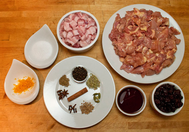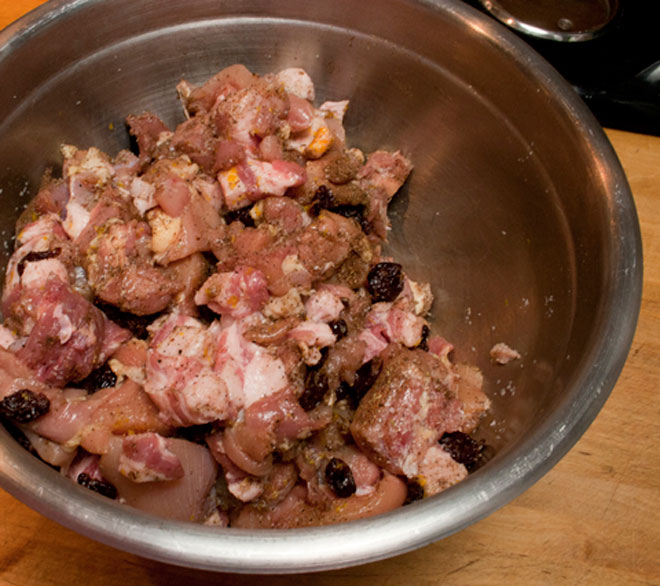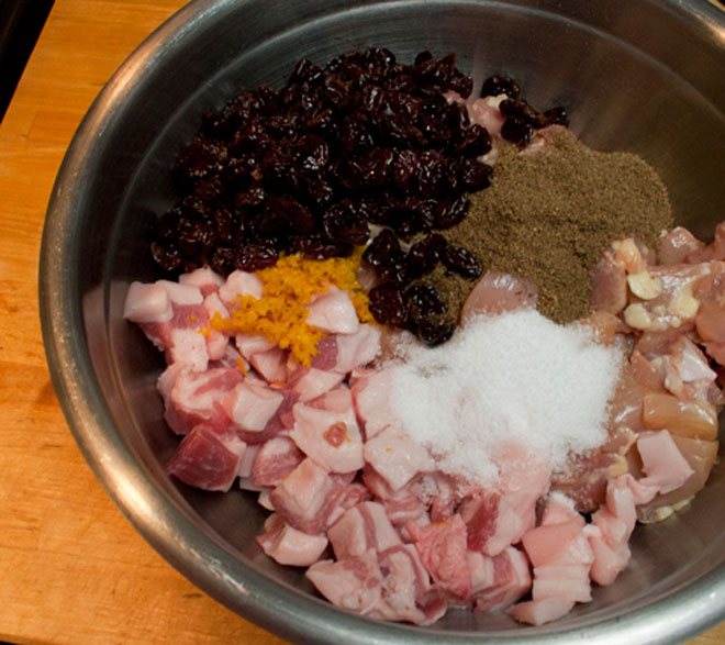 Cho thịt gà, mỡ heo cùng hỗn hợp gia vị và anh đào vào tô lớn, dùng tay trộn đều.