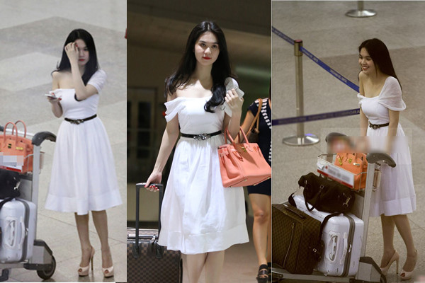 Hình ảnh Ngọc Trinh mặc váy trắng trễ vai gợi cảm và mang những đôi giày cao gót tôn dáng. Hình ảnh này bị nhiều tín đồ thời trang cho rằng Ngọc Trinh điệu đà quá mức bởi ngay các ngôi sao quốc tế cũng chỉ mặc áo phông, quần jeans và dép bệt thoải mái khi xuất hiện ở sân bay.