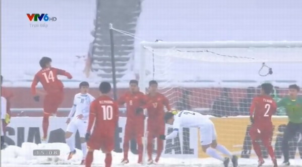 Công Phượng bị phạm lội ngoài vòng cấm, cự ly và góc sút rất thuận lợi. Quang Hải thực hiện cú sút tuyệt đẹp, bóng đi với quỹ đạo cong khó tin gỡ hòa 1-1 cho U23 Việt Nam.