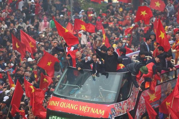 Khi thất bại thì người ta tránh né như hủi hết, nhưng thành công tí thì bu vào, ai cũng muốn dây máu ăn phần: Từ bà tỉ phú Việt Rét, tới mấy em người mẫu thiếu vải, cho đến dàn quan chức và cựu quan chức của VFF, cả cái anh gì đứng trên mui xe hò hét phất cờ như đúng rồi ấy; và tất nhiên thiếu sao được anh đầu ngoẹo ngoẹo và chị gì phốp pháp mặc áo dài kể cả xoa đầu các cháu; rồi nữa, ông cụ trong lăng cũng không được yên...