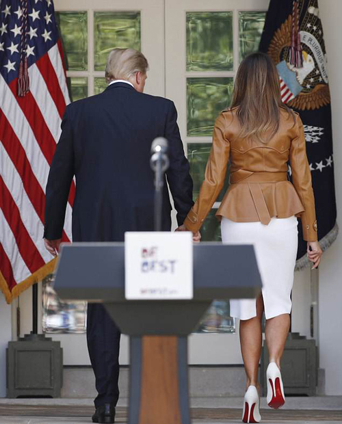 Giữa thời tiết oi bức, phu nhân tổng thống Mỹ mặc chiếc áo khoác da trị giá gần 6.000 USD của thương hiệu thời trang Ralph Lauren, kết hợp chân váy bút chì trắng và mang giày cao gót Christian Louboutin cùng màu. Ở tuổi 48, bà Melania vẫn gây ấn tượng với thân hình chuẩn và gout ăn mặc sang trọng, quý phái.
