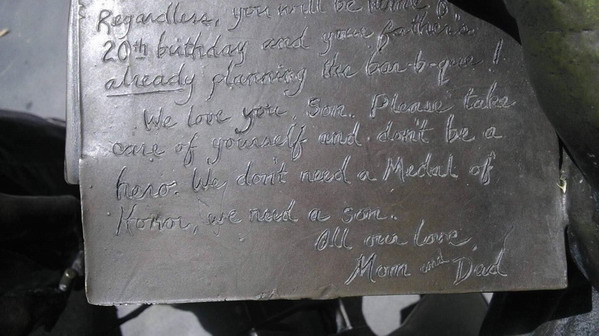 (We love you, son. Please take care of yourself and don’t be a hero. We don’t need a Medal of Honor. We need a son. All our love. Mom and Dad)