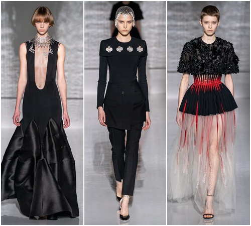 Show diễn của Givenchy bắt đầu với áo khoác đen nhấn vào eo và vạt chéo trắng lệch một bên cùng quần legging da bóng.