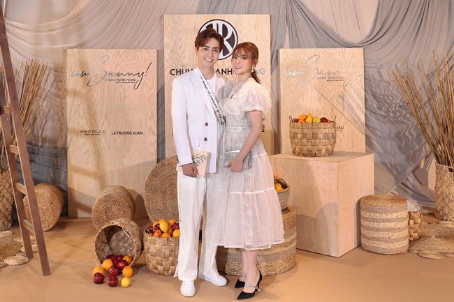 Thu Thuỷ và chồng sắp cưới cùng diện đồ trắng ton-sur-ton. Cặp đôi hạnh phúc tay trong tay, trao nhau những cử chỉ thân mật.