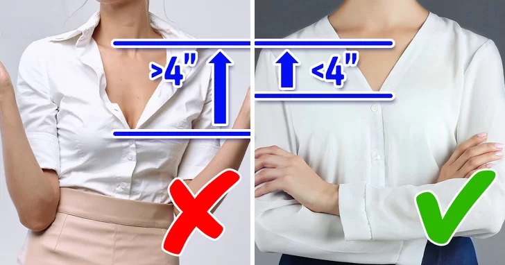 Đôi khi bạn muốn mặc một trang phục hơi lộ liễu, và có thể khoe ngực. Tuy nhiên, tốt nhất cổ áo chỉ nên khoét sâu 5 - 7,5 cm, không nên sâu quá 10 cm. Một chiếc áo ngực phù hợp với bộ ngực của bạn sẽ thực hiện nhiệm vụ khoe vòng một cũng như dáng của bạn tốt hơn.
