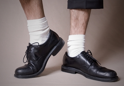 Giày đen (hoặc nâu) mix cùng tất trắng có thể coi là một trong những “thảm họa” của thời trang nam giới. Thay vì tất màu trắng, phái mạnh nên chọn một đôi tất màu đen hoặc tất họa tiết trẻ trung. Tất màu trắng tạo cảm giác như bạn vừa mới ở sân tennis trở về, thay vội đôi giày rồi cứ thế đến thẳng văn phòng làm việc, trông thật chẳng vừa mắt chút nào.