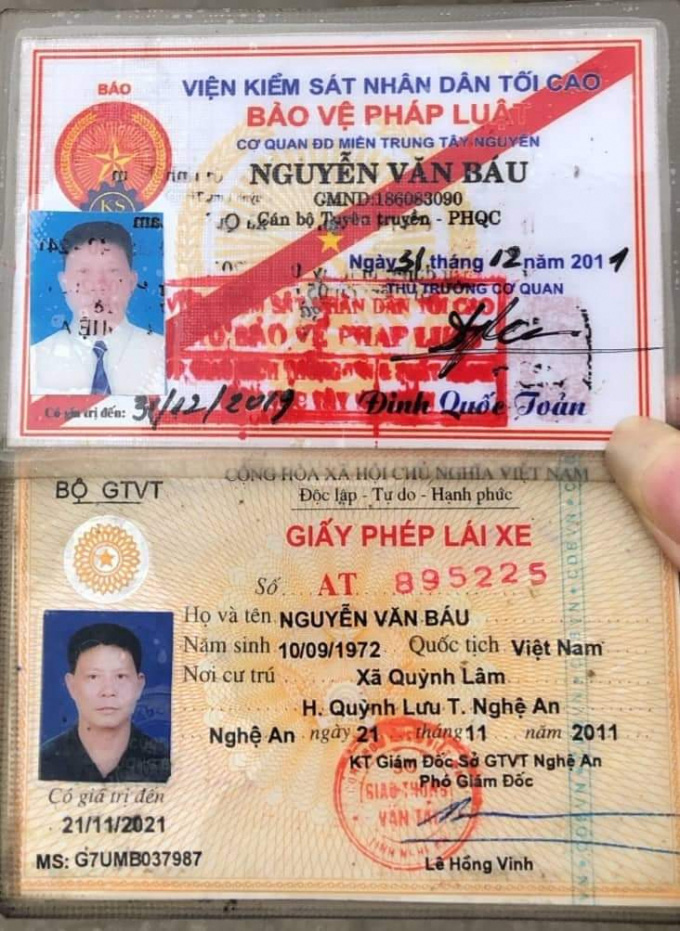 Lúc này, tài xế xuống xe xuất trình 1 giấy phép lái xe mang tên Nguyễn Văn Báu (SN 10-9-1972, nơi cư trú xã Quỳnh Lâm, huyện Quỳnh Lưu, tỉnh Nghệ An), đồng thời đưa ra 1 Giấy chứng nhận (giả mạo) có tên Nguyễn Văn Báu, CMND số 186083090, là cán bộ Tuyên truyền - PHQC Cơ quan đại diện Miền Trung - Tây Nguyên của Báo Bảo vệ pháp luật, do ông Đinh Quốc Toản ký tên, đóng dấu vuông để xin các CSGT bỏ qua lỗi vi phạm luật giao thông