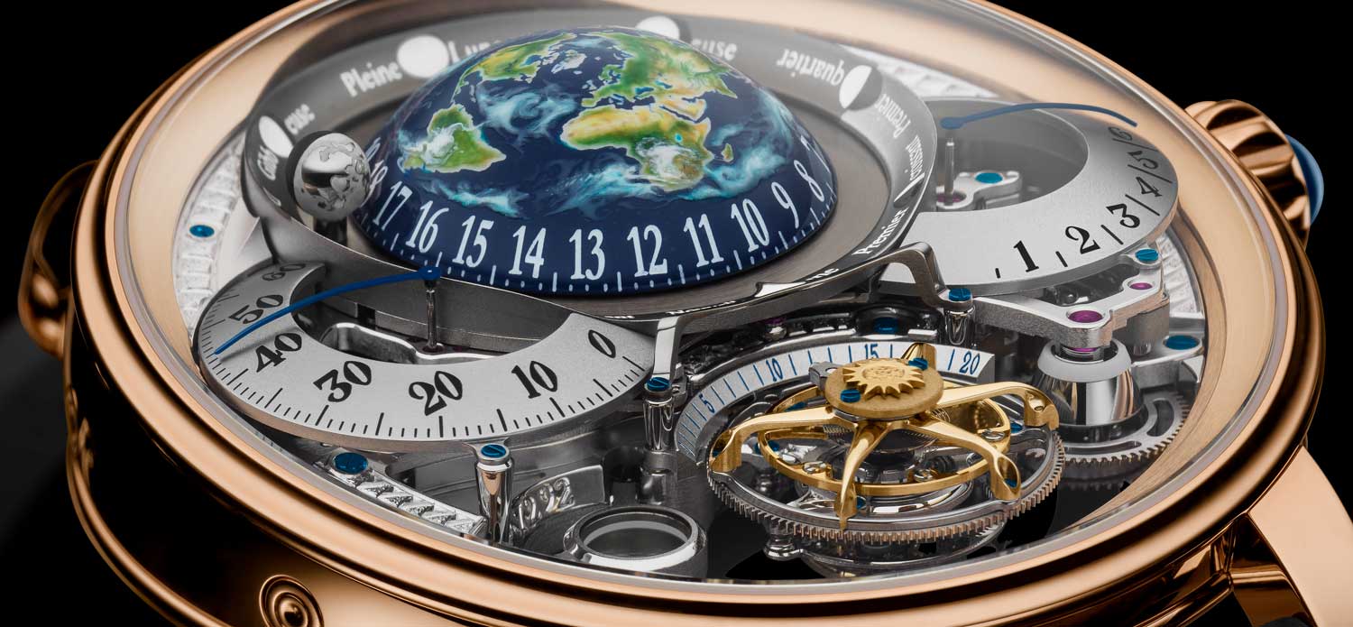 Được đặt ngay bên dưới nó, ở vị trí sáu giờ, bộ phận được gọi là tourbillon. Chúng ta có thể thấy tourbillon quay khi nhìn vào đồng hồ và vị trí của nó giống hệt với vị trí mà mặt trời trong thời điểm đó so với Trái đất. Vì vậy, tourbillon tượng trưng cho mặt trời trong chiếc đồng hồ đeo tay này. Xoay quanh Trái đất là một phiên bản hình cầu thể hiện mặt trăng, được chia thành một bán cầu sáng và một bán cầu tối.