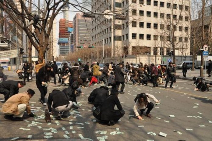 Tiền bao phủ bầu trời Yeouido, tại Hàn Quốc ở Yeouido, Seoul. Một người đàn ông không xác định đã vung ra ngoài cửa sổ khoảng 500 triệu won trên nóc tòa nhà 14 tầng.