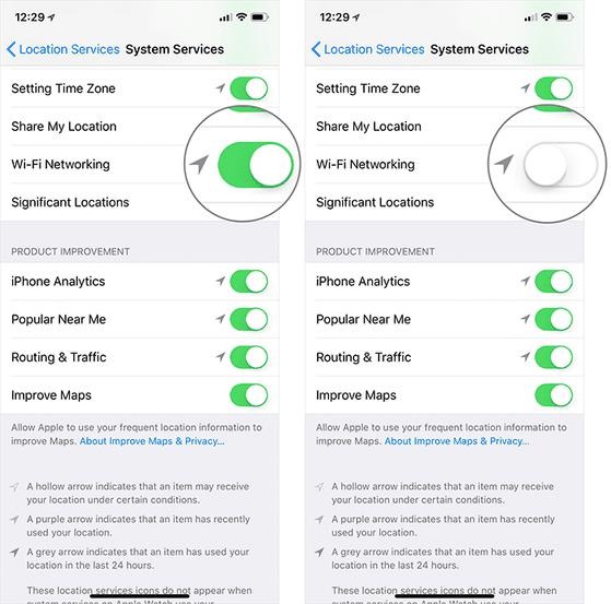 Mặc dù điều này nghe có vẻ kì quặc nhưng dường như có hiệu quả đối với nhiều người dùng iPhone. Để thực hiện, bạn hãy vào Settings (cài đặt) - Privacy (quyền riêng tư) - Location Services (dịch vụ định vị) - System Services (dịch vụ hệ thống) và vô hiệu hóa tùy chọn Wi-Fi Networking.
