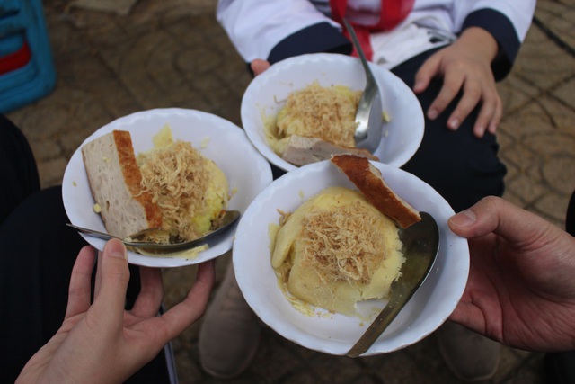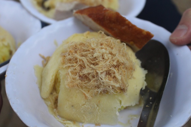 Xôi sẽ được xới ra bát ăn kèm với chả, ruốc theo yêu cầu của từng khách