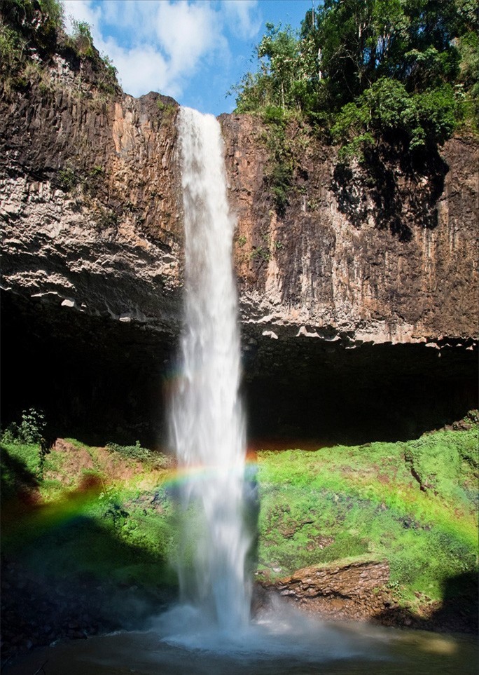 Thác Liêng Nung ở thị xã Gia Nghĩa (Đắk Nông) được quy hoạch thành khu du lịch sinh thái. Dòng nước chảy rì rầm, những hạt bụi nước li ti bắn lên cao, ánh nắng rọi lên đám bụi nước ấy làm xuất hiện cầu vồng. Ảnh: Hoang Phuong.