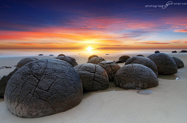 Những khối đá "trứng rồng" nằm rải rác trên bãi biển Moeraki Boulders ở New Zealand