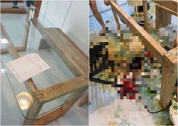 Hình ảnh hiện trường cho thấy tấm kính trên mặt bàn bị vỡ tung thành nhiều mảnh nhỏ li ti.